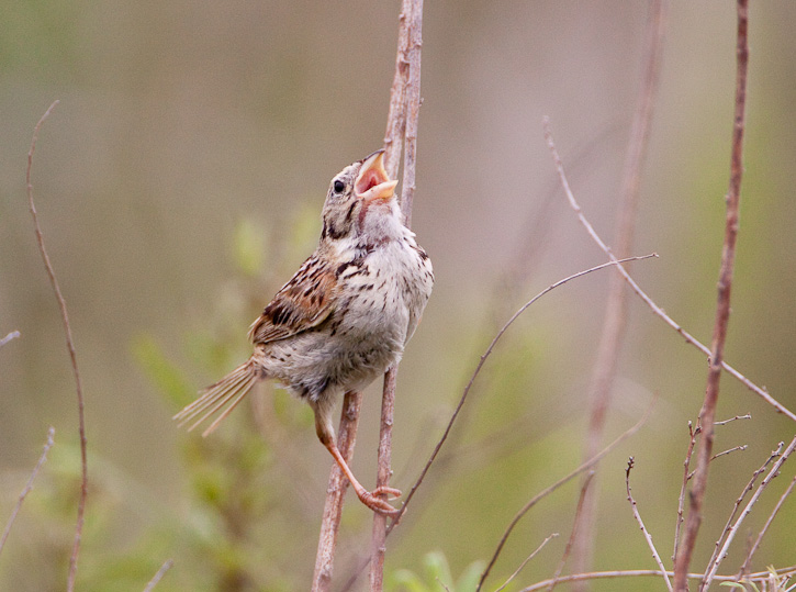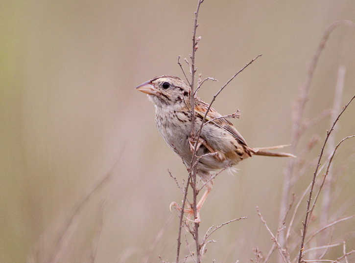 | The next 5 shots show late summer Henslow's Sparrows from the Woodbury Wildlife Area, Coshocton Co., Ohio, in July, 2009. The first of the 5 images shows a juvenile bird, while the next 4 shots show a scruffy looking adult well into its post-breeding moult. These images were taken with a Canon EOS 50D and an EF 500mm F/4 L IS lens. |