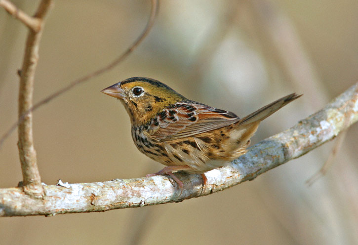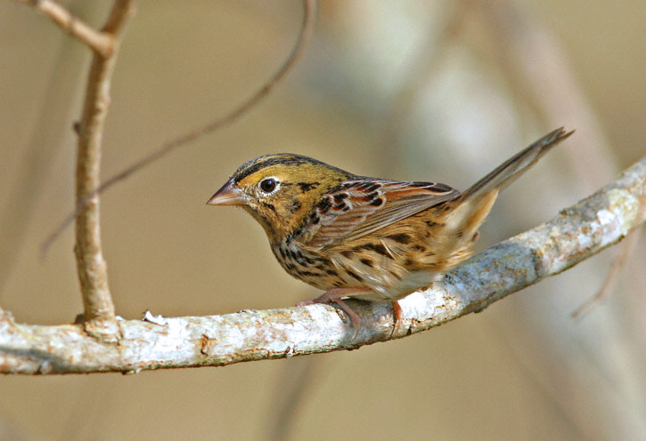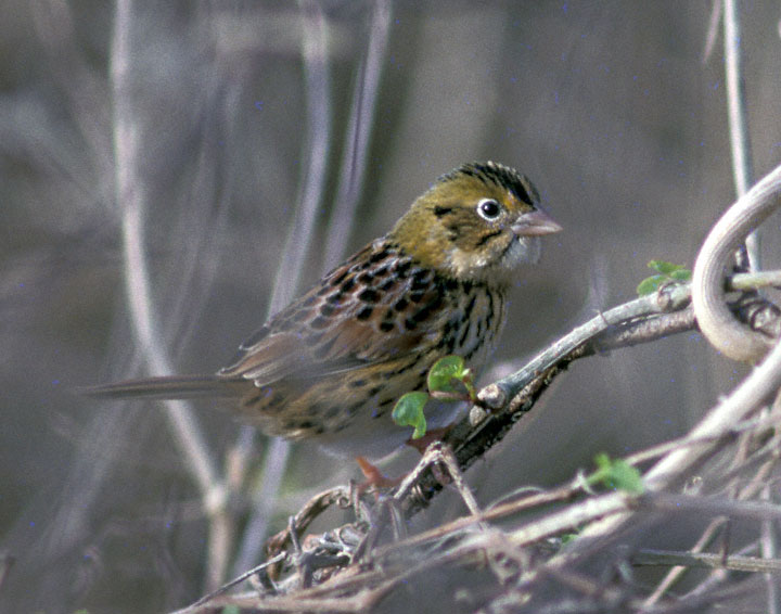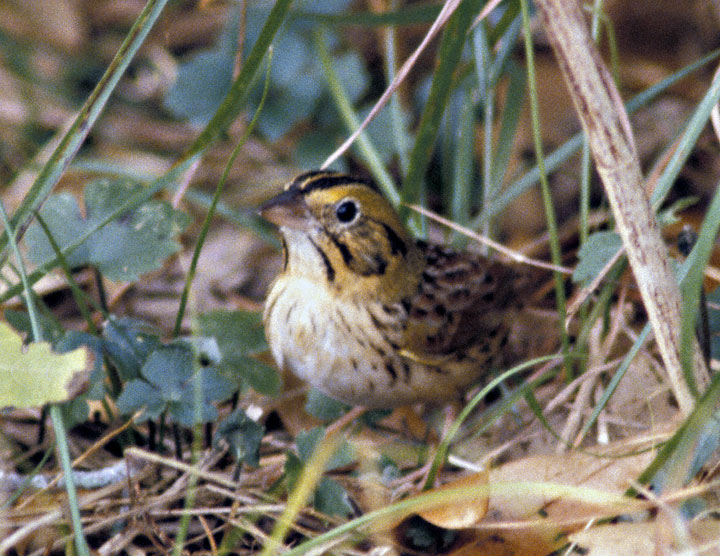 | The Henslow's Sparrow (Ammodramus henslowii) breeds in the eastern Midwest in brushy meadows and grassy fields. It is considered to be a species which is in decline due to habitat loss. It winters in the southeastern United States west to east Texas. The photo at right of a wintering bird was taken at Brazoria N.W.R., Brazoria Co., Texas in December, 1991 with a hand-held (on a BushHawk shoulder mount) Canon T-90 and a FD 400 mm F/4.5 lens with a 1.4X extender on Kodachrome 64. A Fresnel flash was also used. The middle photo, which shows another individual, was taken at Jones Creek, Brazoria Co., Texas in December 1990, with the same equipment, but on Kodachrome 200 with available light. Finally, the bottom two photos were digital captures at Peach Point W.M.A. in Brazoria Co., Texas in December, 2002. These two images were taken with a Canon D60 and EF 300 mm F/4 lens with a 1.4X extender. |