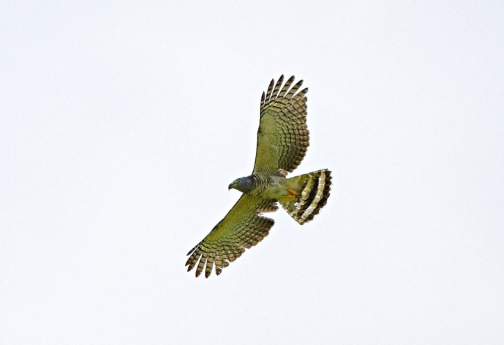 | The Hook-billed Kite (Chondrohierax uncinatus) is an uncommon resident raptor from the southern tip of Texas southward all the way to Argentina in appropriate habitat of forest edges, thorn forest, and mangroves. It feeds primarily on land snails. The bird shown in the shot at right was soaring over thorn forest in southern Tamaulipas, Mexico, in May, 2007. This shot was taken with a Canon EOS 1D Mark II and EF 500mm F/4 L IS lens and 1.4X extender. | ![]() |