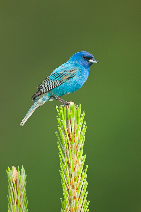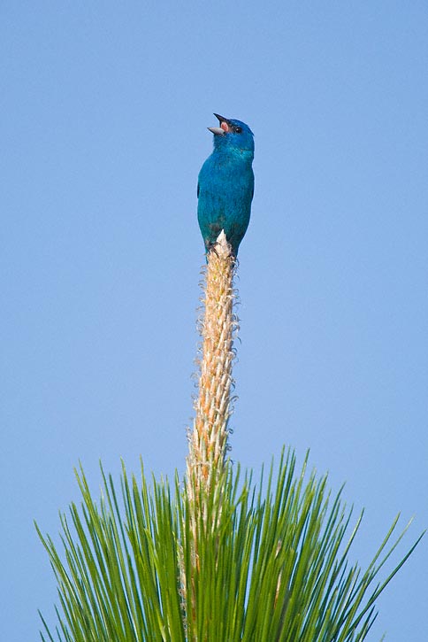 | The male Indigo Bunting shown here was singing from the top of a young pine tree in the Angelina National Forest, Angelina Co., Texas, in June, 2008. This shot was taken with the same gear as the preceding images. |