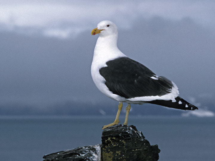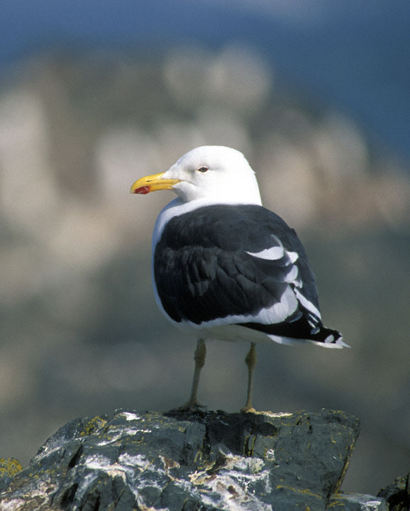 | The Kelp Gull (Larus dominicanus) is also called Southern Black-backed Gull by some authors. It is the only gull species which occurs in Antarctica. The species is very widespread in the southern hemisphere, however, occurring in southern South America, southern Africa, southern Australia, as well as most sub-antarctic islands. In recent years wandering Kelp Gulls have showed up at several locations in the United States. The adult Kelp Gull shown here was photographed at Hannah Point on Livingston Island, Antarctica, in January, 1998, with a Canon T-90 and FD 400mm F/5.6 lens on Fuji Sensia. |