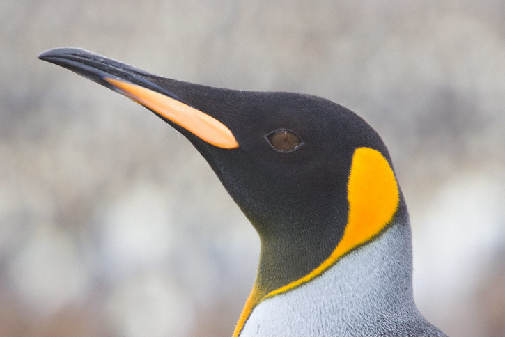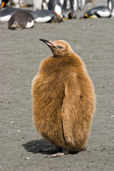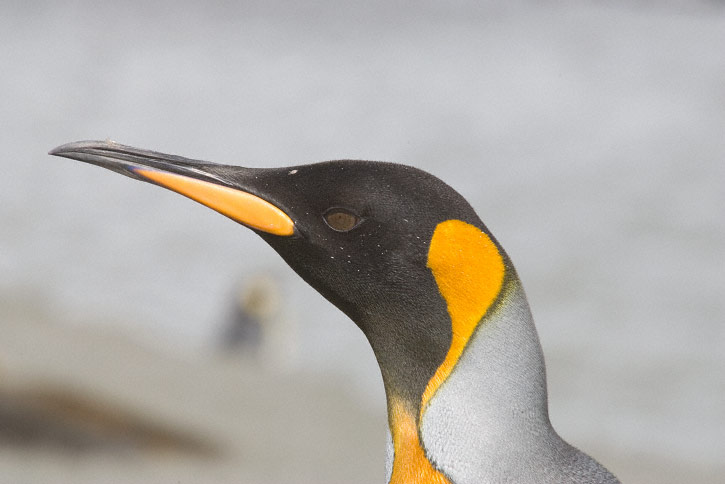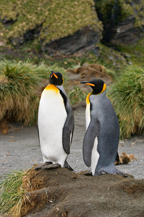 | King Penguin (Aptenodytes patagonicus). Standing three-feet tall and weighing approximately 35-40 pounds, King Penguins are second in size only to the Emperor Penguin (A. forsteri). These are highly social birds that nest in huge colonies on the island of South Georgia and on a number of other sub-antarctic islands. Some of the colonies are known to number 100,000 birds or more. The first set of images here were all taken at Gold Harbor, South Georgia, in January, 2003, with a Canon D60 and EF 70-200 F/2.8 L IS lens and 2X extender. I will note in the captions below when the images are from another trip. |