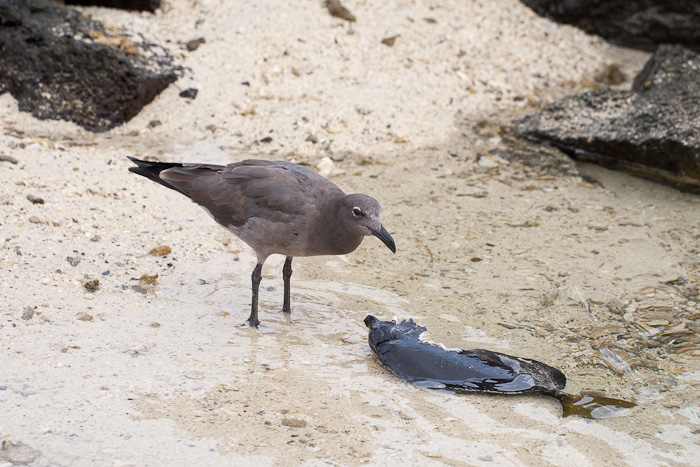 | This immature Lava Gull was also on Tower Island in August, 2010.It has discovered a dead fish which it is investigating. |
