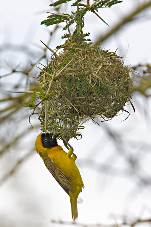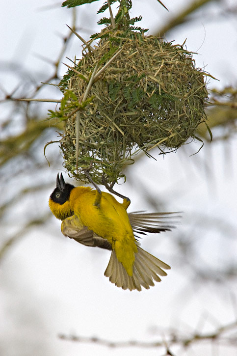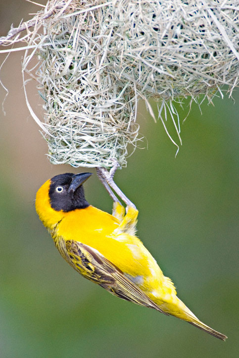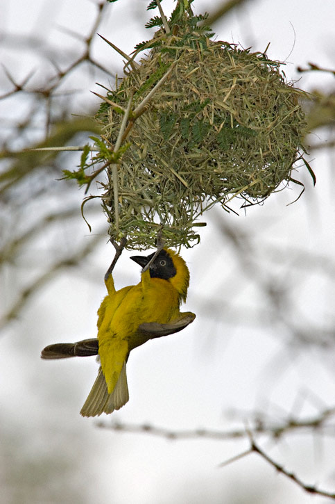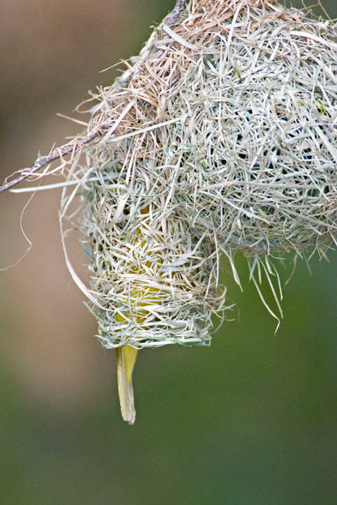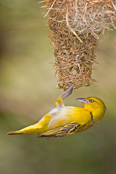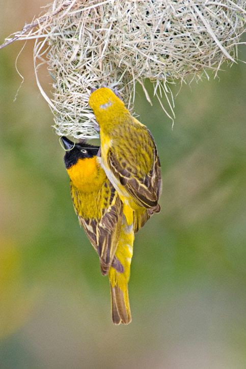 The Lesser Masked-Weaver (Ploceus intermedius) is a common and widespread species of much of southern Africa. The species nests in colonies which can number over a hundred pairs. The nests are woven from grass into round globes and have an entrance hole at the bottom. These nests are often built over water to discourage some predators. The first four shots here were taken near Nylsvley, Limpopo Province, South Africa. Shots 4 through 8 were taken in Kruger National Park, Mpumalanga Province, South Africa. Most of the shots show a male bird, but one of the latter shots shows a pair while another shows a female hanging at the nest entrance. All shots were taken in January, 2006, with a Canon EOS 1D Mark II & EF 500mm F/4L IS lens and 1.4X extender. See shots of a close relative, the Southern Masked-Weaver here. | ![]() |