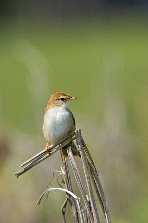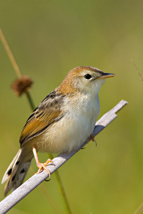 | The Levaillant's Cisticola (Cisticola tinniens) is also known as Tinkling Cisticola by some authors. The species ranges from Angola and Kenya into South Africa. It is a locally common bird usually associated with marsh and wetland habitat. The bird shown here was along the edge of a small lake at Dullstroom, Mpumalanga Province, South Africa in January, 2006. These digital shots were taken with a Canon EOS 1D Mark II & EF 300mm F/4L IS lens and 2X extender. | ![]() |