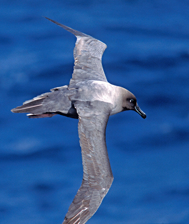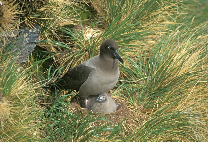 | The Light-mantled Albatross (Phoebetria palpebrata) , sometimes called Light-mantled Sooty Albatross, nests along the cliff faces on the island of South Georgia in the south Atlantic Ocean as well as many other sub-antarctic islands. This species, which I regard as the most beautiful of the albatrosses, has a haunting call that echoes through the entire area near these nesting sites. The adult and chick shown here were photographed at Gold Harbor, South Georgia, in January 1996 with a Canon T-90 & FD 400mm F4.5 lens on Fuji Sensia 100 film. |