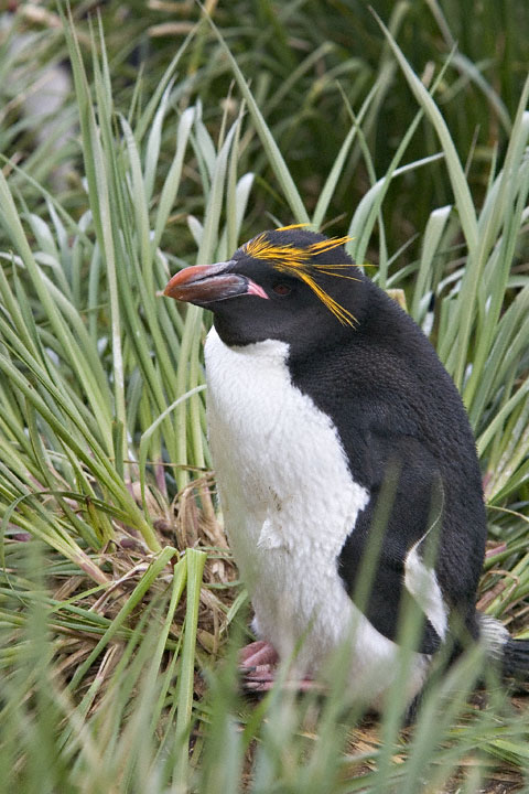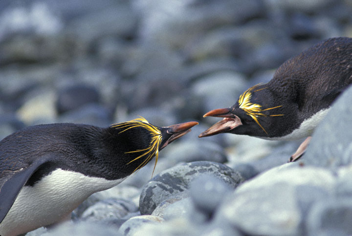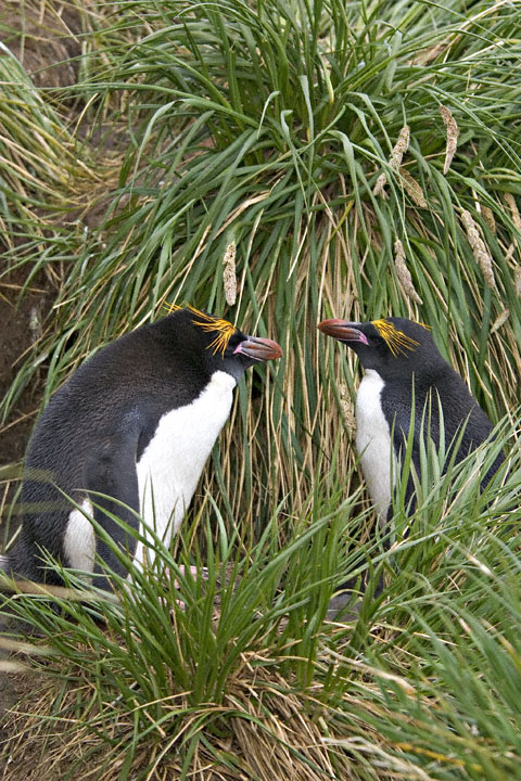| The Macaroni Penguin (Eudyptes chrysolophus) occurs on sub-Antarctic islands from islands off the coast of South America to South Georgia to islands south of New Zealand. There are a few pairs that nest regularly on the Antarctic Peninsula, mainly at Hannah Point on Livingston Island. The shots here were all taken at Cooper Bay, South Georgia. The first shots show some adults near their nesting colony in January, 2003. Those two shots were taken with a Canon D60 and EF 70-200 F/2.8 L IS lens and 580 flash. The shot of the two adults in a little squabble was taken in January, 1996, with a Canon T-90 and 400mm F/5.6 lens. |