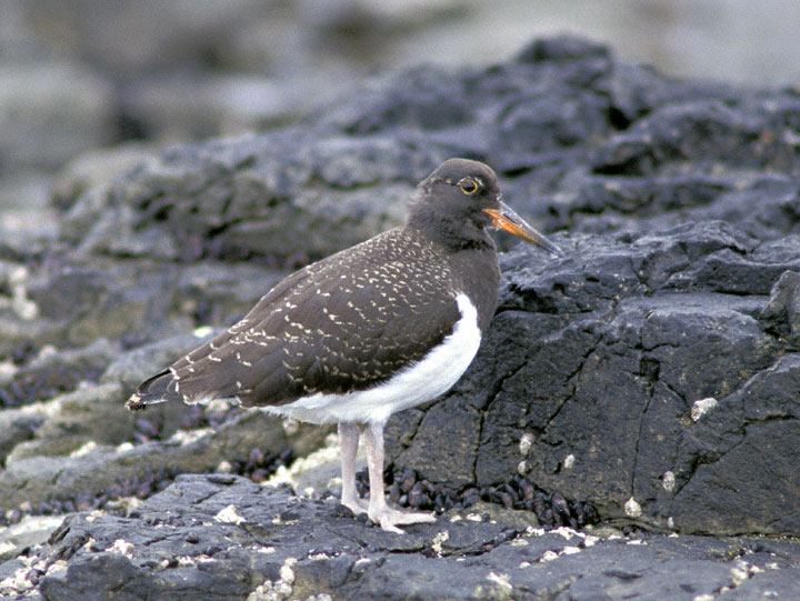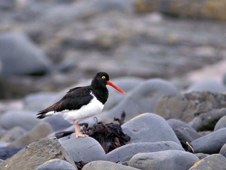 The Magellanic Oystercatcher (Haematopus leucopodus) occurs in southern Chile, Argentina, and the Falklands. It is superficially similar to the American Oystercatcher (Haematopus palliatus), more familiar to North American observers, but is blacker backed and shows a yellow rather than a red eye-ring. This bird was photographed on Bleaker Island in the Falklands in January, 1996, with a Canon T-90 & FD 400mm F4.5 lens mounted on a tripod with Fuji Sensia 100 film. This bird was close by a juvenal which can be seen in the below photo. |