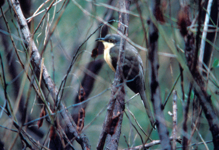| The Mangrove Cuckoo (Coccyzus minor) is a resident of tropical deciduous forest, mangrove forest and gallery forests across most of the Caribbean Islands as well as parts of Mexico and Central America. It is a rare resident of south Florida and has occurred in a few other states along the Gulf of Mexico. The first two shots here were taken in Guanica, Puerto Rico, in July, 1998, with a Canon T-90 and FD 400mm F/4.5 lens on Fuji Sensia. The bird in these photos as well as those which occur in Florida visually look the same and may be of the subspecies maynardi. The vagrants to Texas are thought to be of the subspecies continentalis and are more buffy underneath and darker overall than the Florida birds. The 3rd shot shows an early Texas record. |