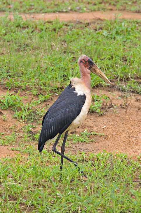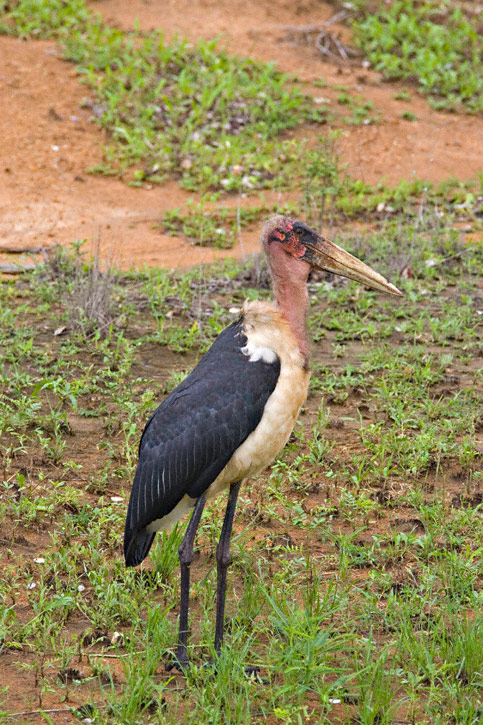 | The Marabou Stork (Leptopilos crumeniferus) is a widespread species of the grasslands and savannas of Africa. It is a large, powerful species and often feeds on the leftovers from game kills and other carrion. It also catches frogs, fish, rodents, and pretty much anything else. The bird shown here was one of a group of about a dozen individuals feeding in a drying lake bed near Phalaborwa, Limpopo Province, South Africa in January, 2006. These digital shots were taken with a Canon EOS 1D Mark II & EF 500mm F/4L IS lens and 1.4X extender. | ![]() |