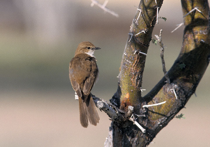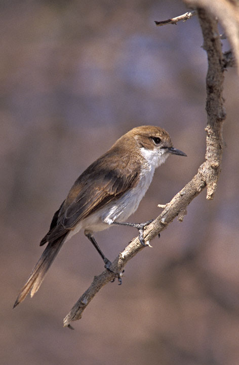 | The Marico Flycatcher (Bradornis mariquensis) is a small, very plain brown and white flycatcher of southern Africa. It is often quite conspicuous and perches in open locations such as fences and bare limbs. The shots here were taken in October, 1998, in Etosha National Park, Namibia, with a Canon EOS 1N and EF 300mm F/2.8 L lens and 2X extender on Fuji Sensia. | ![]() |