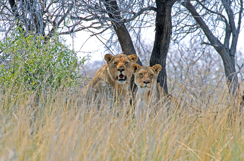 | The African Lion (Panthera leo) is well known to people around the world from movies and books. In person, it is an impressive beast to behold. On my two brief Africa trips I have only been fortunate enough to see this species twice, but I have posted a couple of photos here. On the right a female and a cub watch me curiously. I was taking this shot from a vehicle window. This shot was taken in Etosha National Park, Namibia, in October, 1998. |