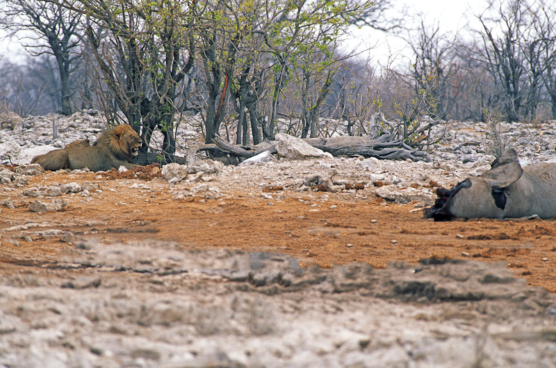 | The image at right shows two African Lions resting under a tree after they have gorged themselves on the carcass of a small elephant. Like the previous shot, this one was taken in Etosha National Park, Namibia, in October, 1998. |