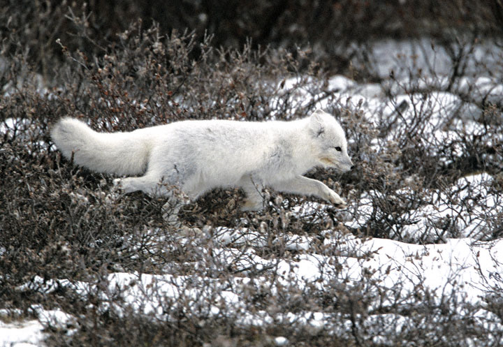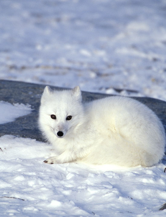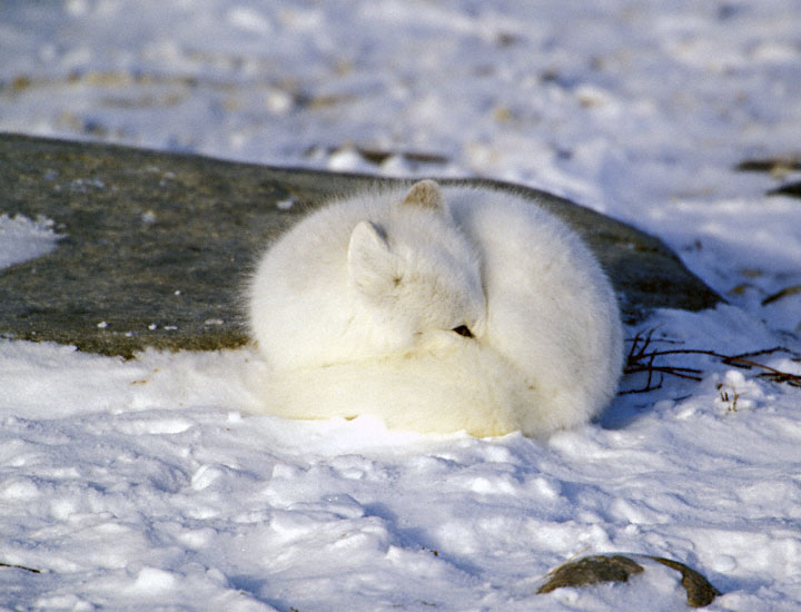 | The Arctic Fox (Alopex lagopus) ranges across all of far northern Canada and Alaska. It is brown in the summer and pure white in the winter months. The species often follows Polar Bears across the arctic ice pack where it feeds shown here-overs of the bears. The individual in the top photo was patrolling an area of willow scrub in Churchill, Manitoba in November, 2000. The next three shots show a sleeping Arctic Fox as it keeps a wary eye open to watch for danger, then becoming more alert while watching the human intruder in its domain, then finally showing a lazy yawn. All these images were taken with a Canon EOS 1V and an EF 500 mm F4L IS lens on Fuji Provia 100. The bottom shot is a digital capture in November, 2003, at Churchill. The image was taken with a Canon 10D and EF 70-200 F/2.8 L IS lens and 2X extender. | ![]() |