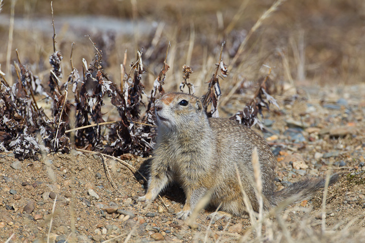 | The Arctic Ground Squirrel (Spermophilus parryii) occurs across parts of northwestern Canada and much of Alaska. The species inhabits meadows, rocky areas, as well as tundra areas. The first four images on this page show an Arctic Ground Squirrel near Gambell, St. Lawrence Island, Alaska, in May, 2012. These shots were taken with a Canon EOS 1D Mark IV and an EF 500mm F/4 L IS lens and 1.4X extender. | ![]() |