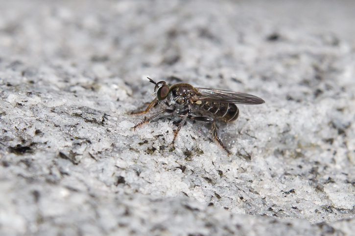 | The tiny robber fly on the right is Atomosia puella. This shot was taken near Mountain City, Rabun Co., Georgia, in May, 2011, with a Canon EOS 1D Mark IV and a Sigma 50-500mm lens and Canon 580 flash. My thanks to Mike Thomas and Giff Beaton, who were in the field with me this day, for the identification of this robber. | ![]() |