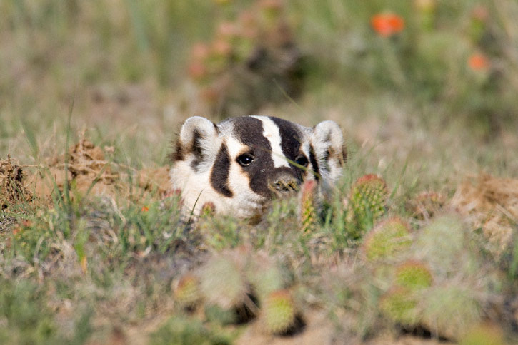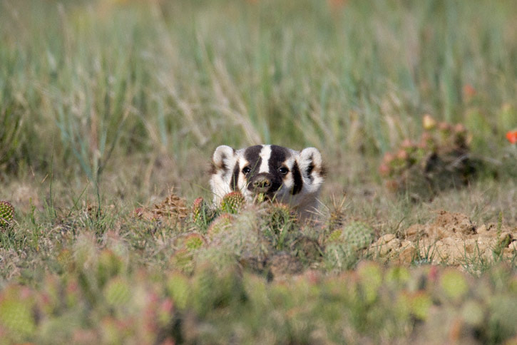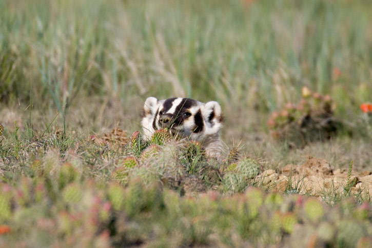 | The Badger (Taxidea taxus) also called American Badger, is a member of the weasel family. It is a powerful digger and is fairly uncommon. It is a resident over the western two thirds of the U.S. as well as large parts of Canada and Mexico, but in recent times is seldom seen. The animal digs up gophers and ground squirrels as well as snakes, insects and may eat almost anything it can subdue. The Badger shown in the first three shots at right was peering at me from its burrow on the Pawnee National Grasslands, Weld Co., Colorado, in June, 2007. These shots were taken with a Canon EOS 1D Mark III and EF 600mm F/4 lens. |