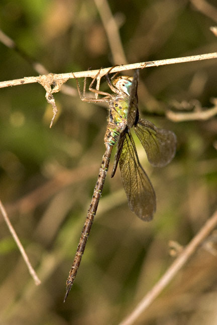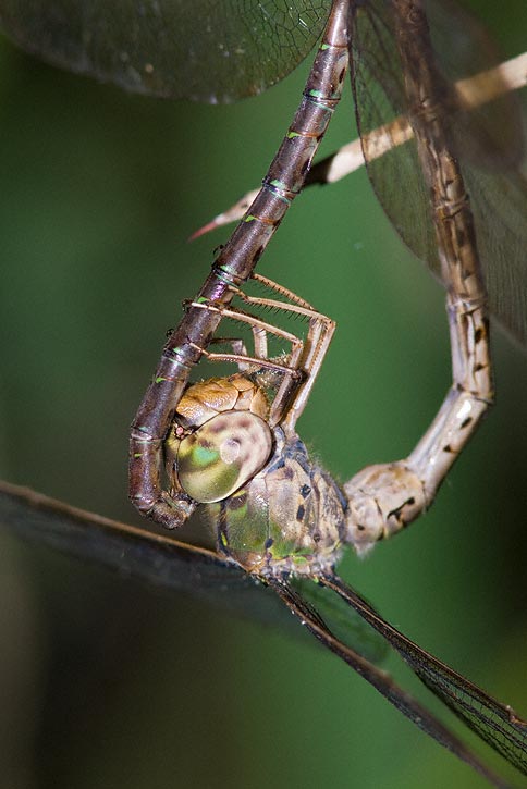 | The next 2 shots of a hanging male Bar-sided Darner were taken in June, 2009, at Santa Ana N.W.R., Hidalgo Co., Texas. These shots were taken with a Canon EOS 1D Mark III and EF 300mm F/4 l IS lens and 2X extender and 580 flash. |