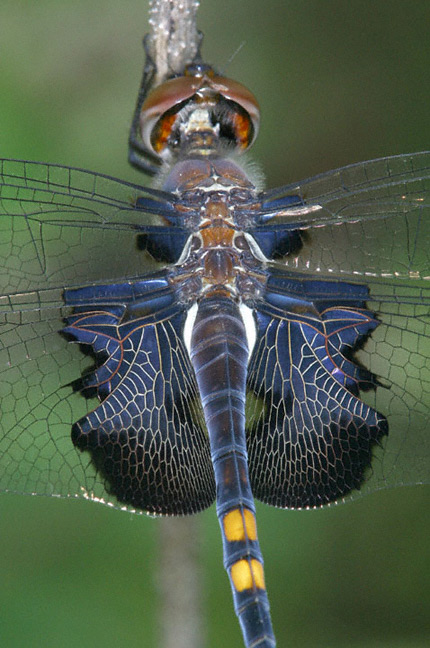 | The Black Saddlebags (Tramea lacerata) is a member of the group of dragonflies known as Saddlebag Gliders. They get this name from the dark band at the base of each hind wing which might look somewhat like saddlebags. The first two images on this page, digital captures, were shot in June, 2003, in Austin, Travis Co., Texas. The first image was shot with a Canon EOS 10D and EF 70-200mm F2.8L IS lens with a 2X extender and 550 EX flash. I thought the wing vein pattern at the base was particularly interesting, so I tried a few different macro shots with a Canon 180 mm Macro and Canon D60. The second image was shot with this equipment. The third image was shot in June, 2004, in Travis Co., Texas of a young male Black Saddlebags. This was also a digital shot, but with a Canon EOS 1D Mark II and an EF 300mm F/4 L IS lens, 2X extender and 550 EX flash. |