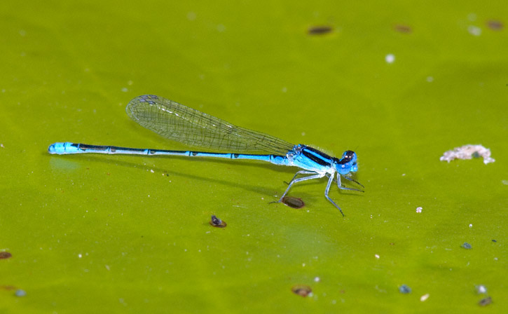 The Black-tailed Bluet (Azuragrion nigridorsum) ranges from central Africa to Zululand and into northeastern South Africa. Its preferred habitat is still water, such as small ponds, dams, etc. The shot here of a male was taken at a pond near Nylsvley, Limpopo Province, South Africa. The shot was taken in January, 2006, with a Canon EOS 1D Mark II and EF 300mm F/4 L IS lens and 2X extender with a 580 flash. | ![]() |
