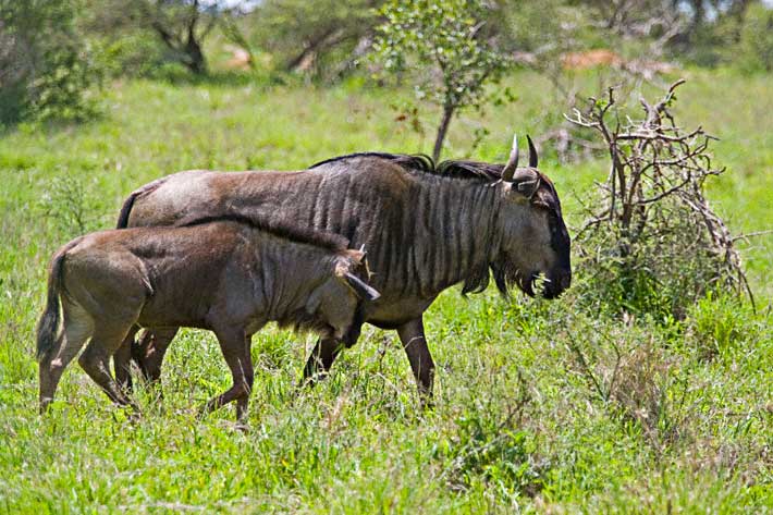 | The Blue Wildebeest (Connochaetes taurinus) is one of the characteristic large mammals that one may see when visiting game parks in much of southern Africa. The animal is sometimes called a Gnu. The images shown here were taken with a Canon EOS 1D Mark II and EF 500 mm F/4 L IS lens and 1.4X in January, 2006. The first two shots were taken in the Nylsvley Nature Reserve in Limpopo Province, South Africa while the next two shots were taken in Kruger National Park, Mpumalanga Province, South Africa. The bottom shot, of a mother and calf, was taken in the harsh light of mid day, but is the best I could do under the circumstances. | ![]() |