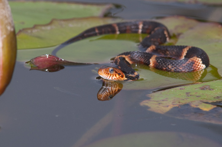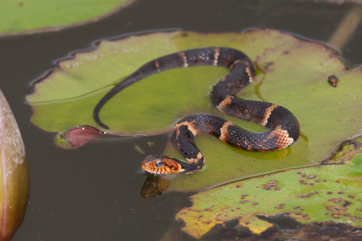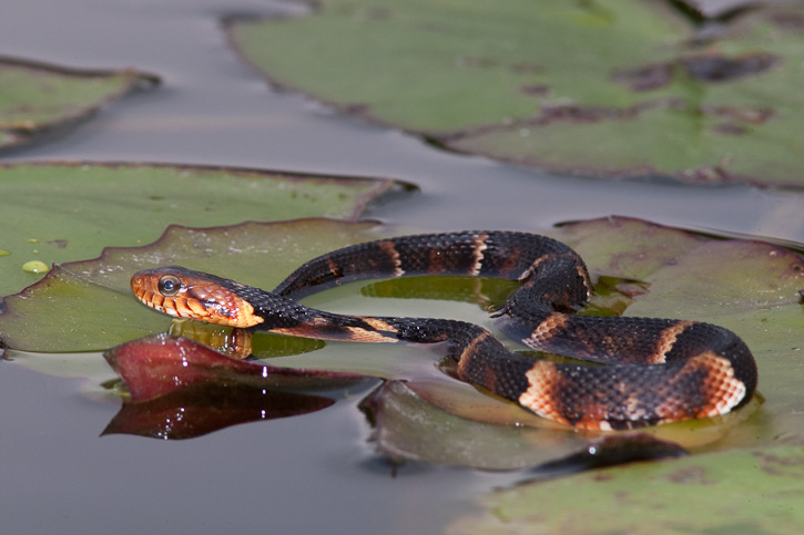 | The Broad-banded Water Snake (Nerodia fasciata confluens) occurs across much of the eastern United States including the eastern third of Texas. The young one shown in the first three images here was in Victoria Co., Texas, in November, 2009. These shots were taken with a Canon EOS 1D Mark III and an EF 300mm F/4 L IS lens and 580 flash. | ![]() |