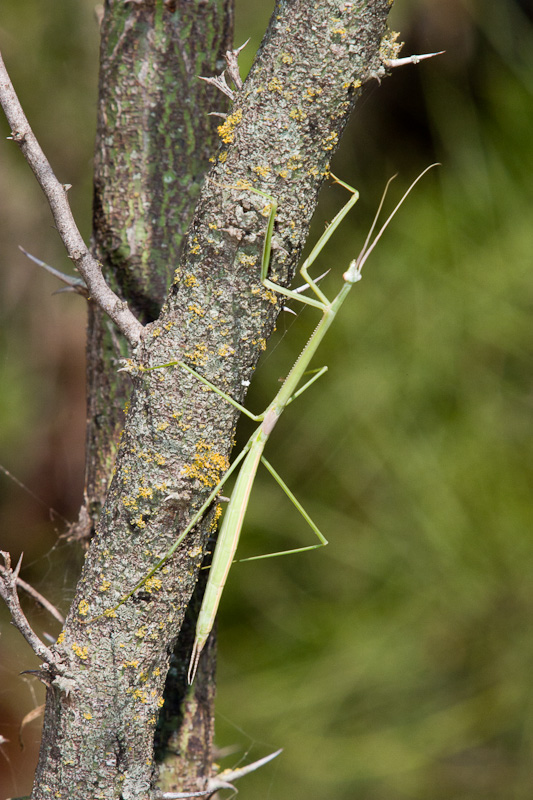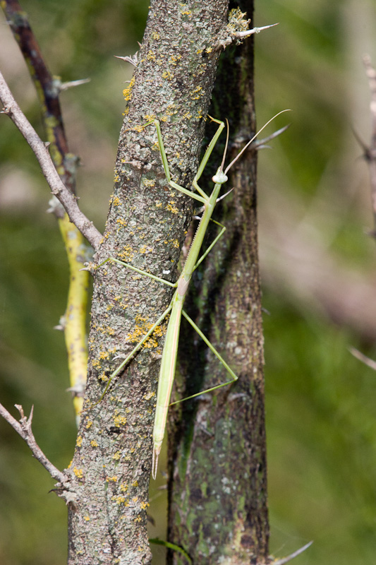 | The Brunner's Mantis (Brunneria borealis) in the first two images on this page was photographed in Austin, Travis Co., Texas, in August, 2003. The Brunner's Mantis looks much like an insect called a Walking Stick, but it is a true Mantis. This mantis can be extremely difficult to locate as it moves along green leaves and twigs, but when out in the open, such as this one, they are quite visible. Interestingly, males are unknown for this species, and reproduction is by means of parthenogenesis, which means that the female is able to produce eggs that can develop without fertilization. | ![]() |