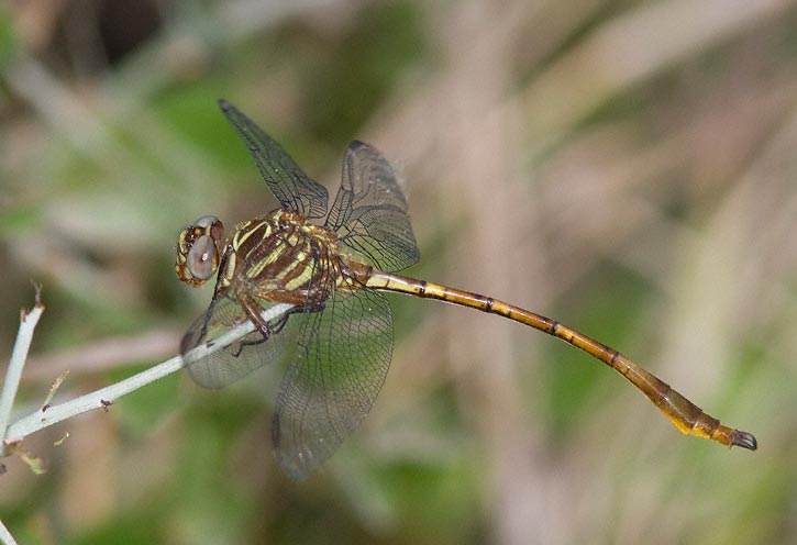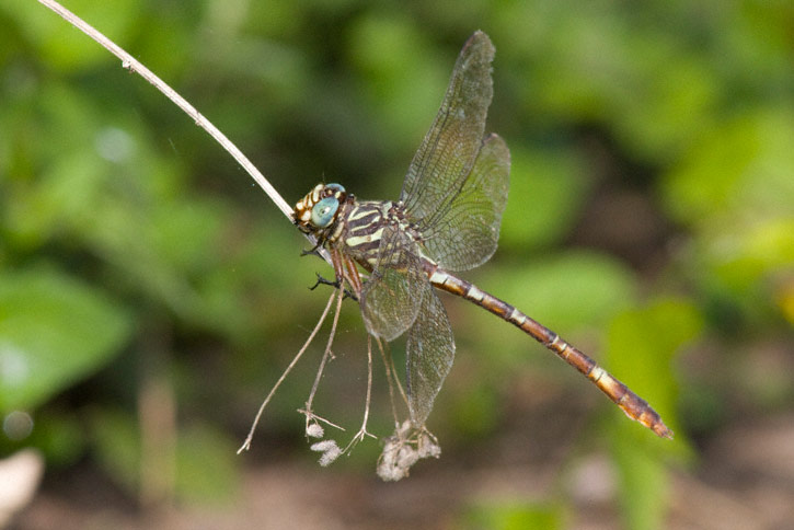 | The next 2 shots show a male Broad-striped Forceptail which had been injured, or perhaps deformed upon emergence, causing the abdomen to be twisted around 180 degrees. This guy flew fine, but would not have been able to reproduce. | ![]() |