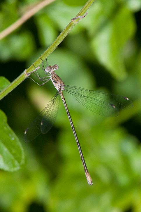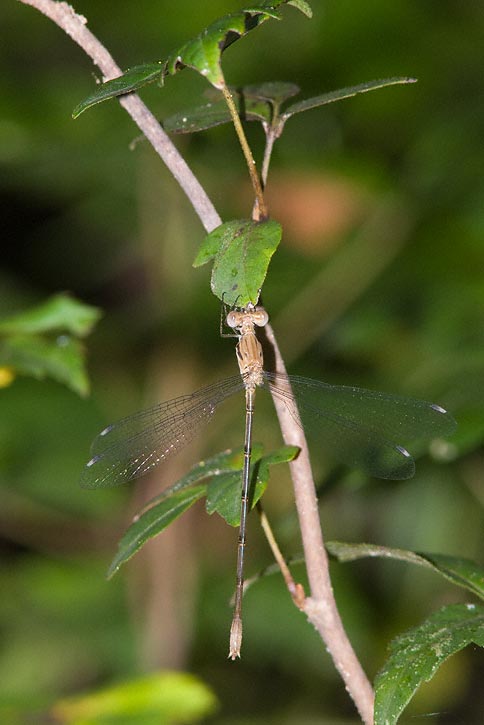 | The female Chalky Spreadwing in the next 2 shots was along the Medina River just south of San Antonio, Bexar Co., Texas, in September, 2008. These two images were shot with a Canon EOS 1D Mark III and EF 300mm F/4 L IS lens and 2X extender and 580 flash. | ![]() |