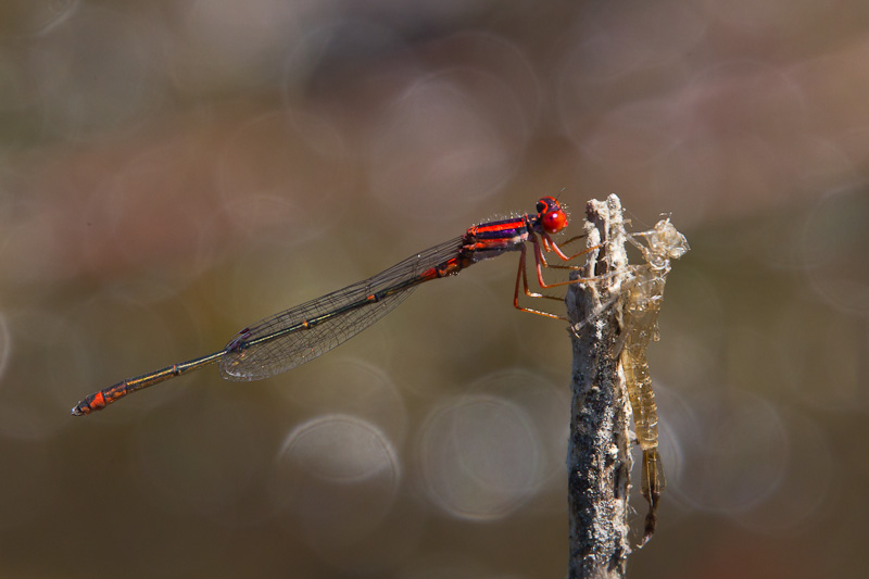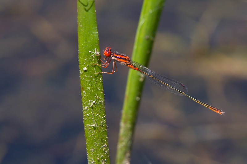 | The Cherry Bluet (Enallagma concisum) is a pond damsel of the southeastern United States where it may be found on sandy bottomed ponds. It is very similar to the Scarlet Bluet (E. pictum) of the northeast, but their ranges do not overlap. The first two shots, both of males, on this page were taken in Conway, Horry Co., South Carolina, in May, 2012, with a Canon EOS 1D Mark IV and a Sigma 50-500mm lens and Canon 580 flash. | ![]() |