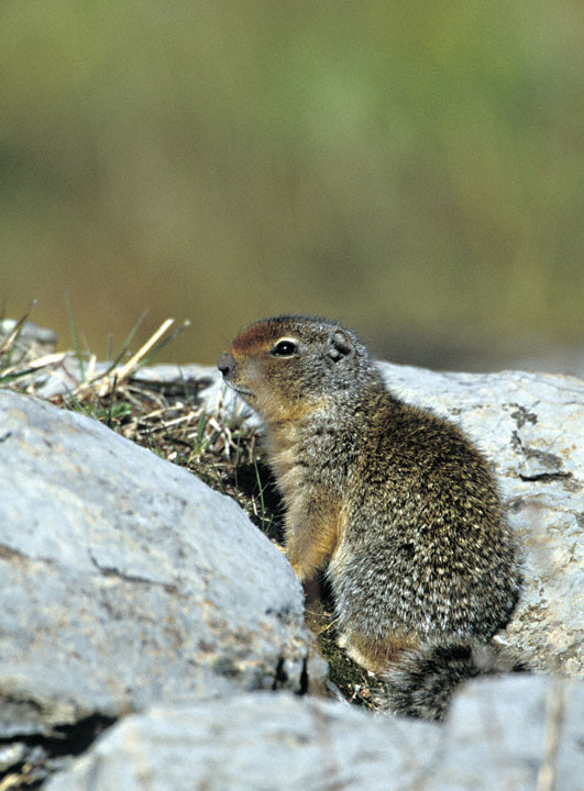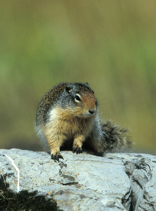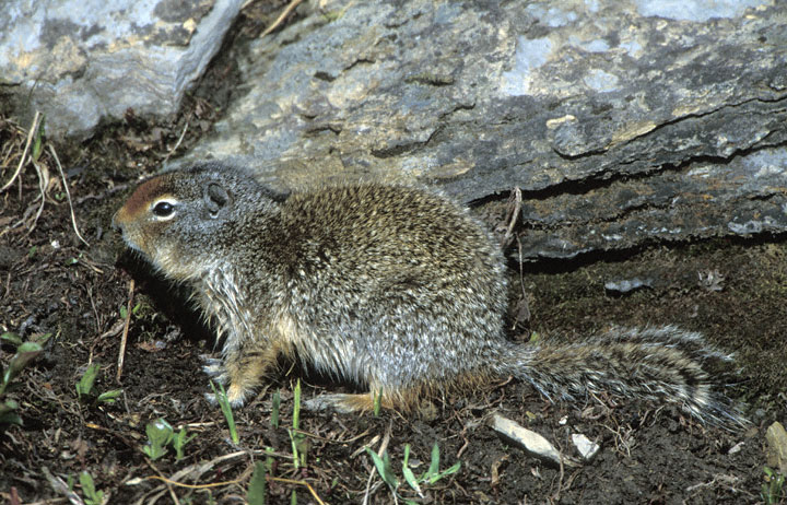 | The Columbian Ground Squirrel (Spermophilus columbianus) ranges across part of the Rocky Mountains from parts of western Canada into higher elevations of Montana, Idaho, Washington and Oregon. The animal lives in loose colonies in alpine meadows and other grasslands. The individuals shown here were photographed in June, 2001, at Logan Pass, Glacier National Park, Glacier Co., Montana. All images were taken with a Canon EOS 3 and an EF 500 mm F4L IS lens on Fuji Provia 100. | ![]() |