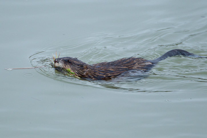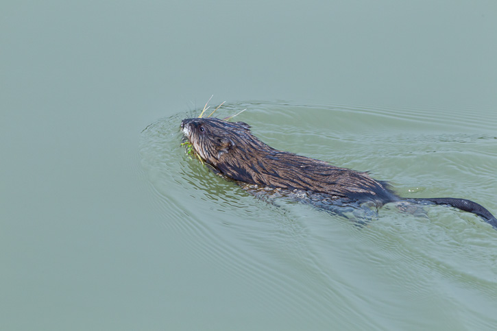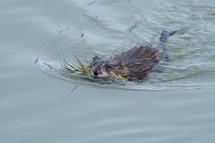 | The Common Muskrat (Ondatra zibethicus) is an aquatic rodent that occurs across most of North America. It inhabits freshwater or brackish marshes and waterways where it feeds on aquatic vegetation. The first three shots on this page show a muskrat carrying nesting material to a nest site at Westchester Lagoon, Anchorage, Alaska, in May, 2012. These shots were taken with a Canon EOS 1D Mark IV and an EF 500mm F/4 L IS lens. | ![]() |