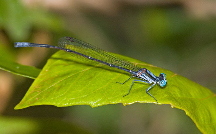 The Common Threadtail (Elattoneura glauca) ranges from central and west Africa into South Africa. Its preferred habitat includes the grassy edges of flowing streams. The shot here of a male was taken along a stream in the Blyde River Canyon, Mpumalanga Province, South Africa. The shot was taken in January, 2006, with a Canon EOS 1D Mark II and EF 300mm F/4 L IS lens and 2X extender with a 580 flash. | ![]() |