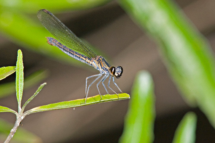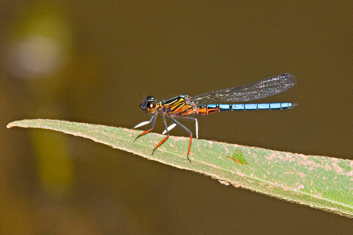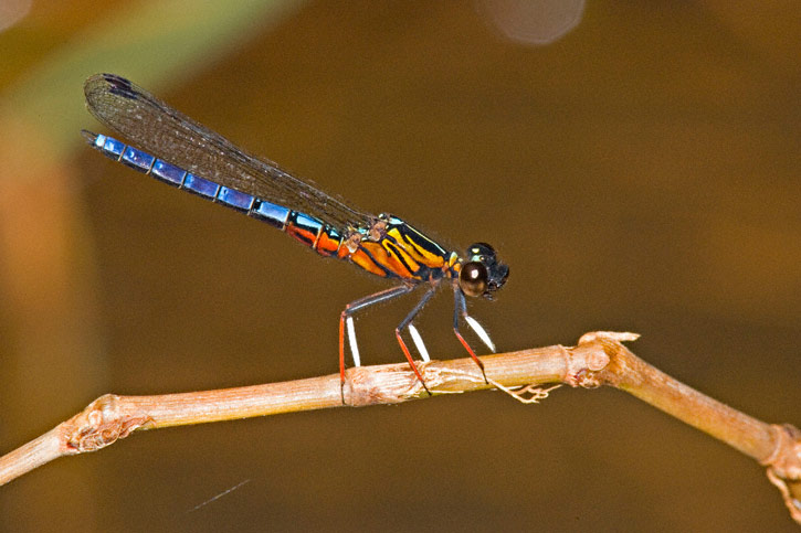 The Dancing Jewel (Platycypha caligata) is certainly one of the most beautiful damselflies I have ever seen. The species occurs from east and central Africa southward into southern South Africa. It inhabits flowing wooded streams often perching in sunny spots. The outside of the lower legs of the male are red while the insides are white. The three shots of males and the two shots of females were all taken in January, 2006, in the Blyde River Canyon, Mpumalanga Province, South Africa with a Canon EOS 1D Mark II and EF 300mm F/4 L IS lens and 2X extender and 580 flash. | ![]() |