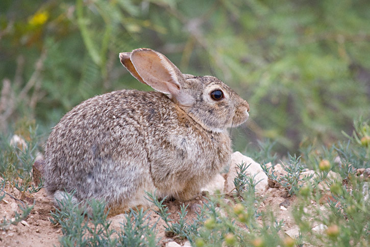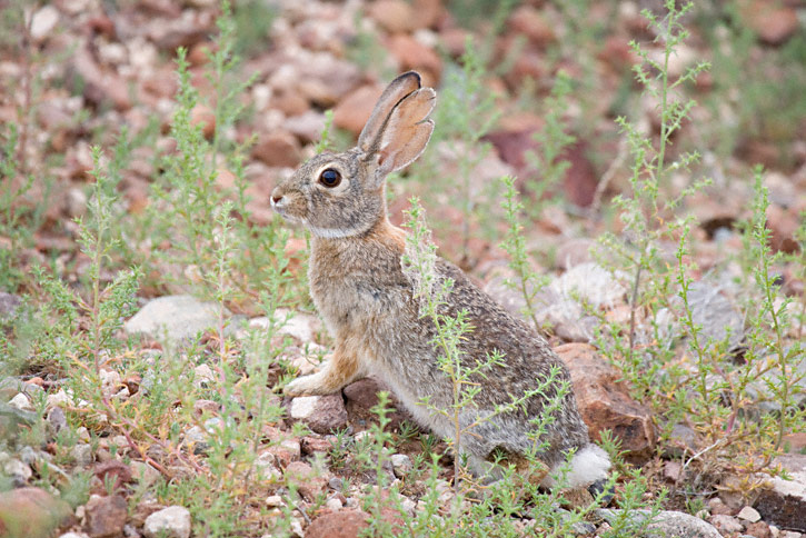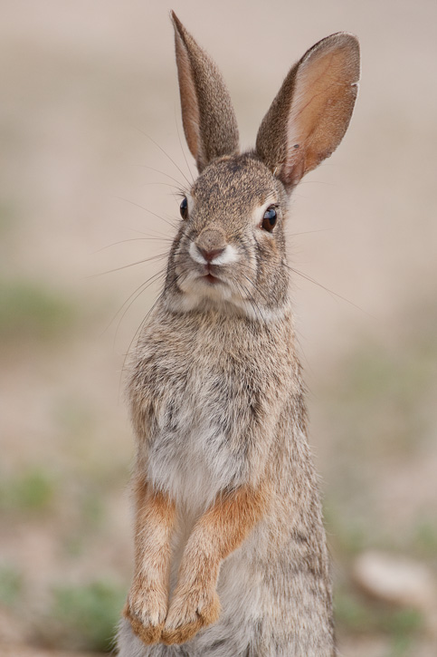 | The Desert Cottontail (Sylvilagus audubonii) is a resident cottontail from much of Mexico northward through the American west north to Montana. It may inhabit pinyon-juniper woodland, brush, riparian areas as well as true desert habitats. Its range overlaps with Eastern Cottontail and Mountain Cottontail and identification of most individuals is difficult. The first 3 shots of the Desert Cottontails on this page were taken near Balmorhea Reservoir in Reeves Co., Texas, in June, 2007 with a Canon EOS 1D Mark III and EF 100-400 F/4.5-5.6 L IS lens.. |