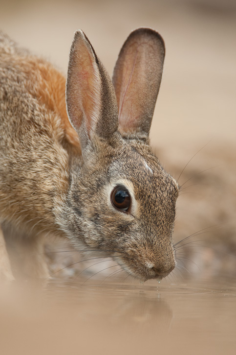 | The Desert Cottontail shown here was at a small water hole in Starr Co., Texas, in May, 2009. This shot was taken with a Canon EOS 50D and an EF 800mm F/5.6 L IS lens. |