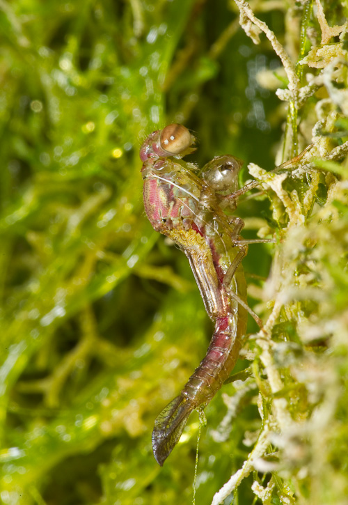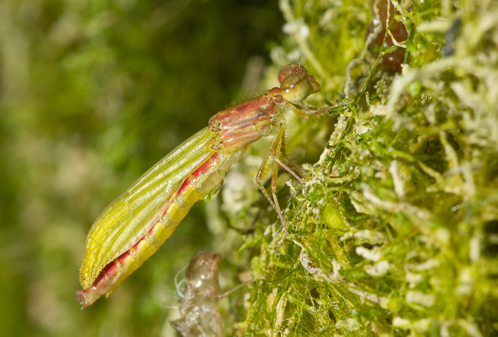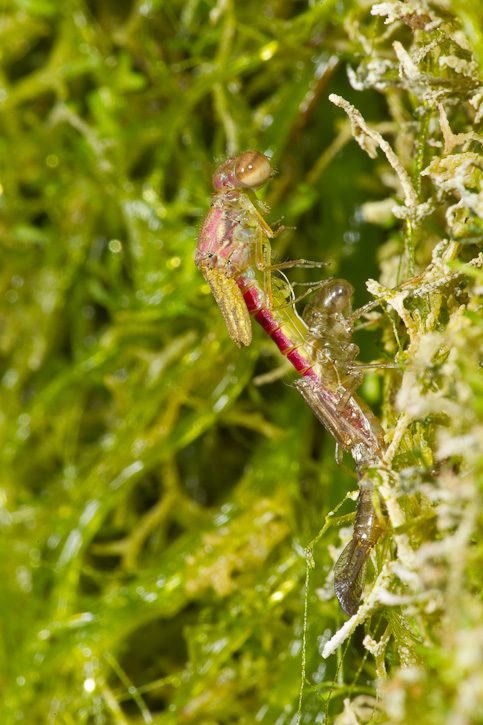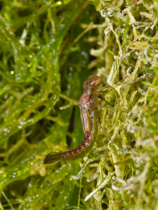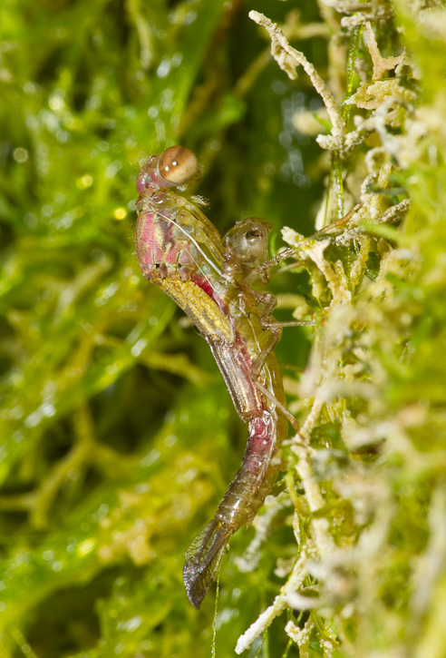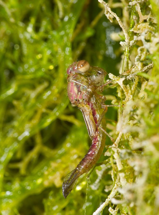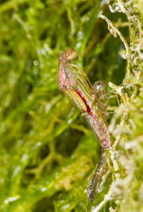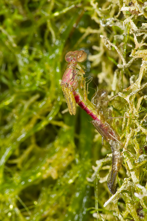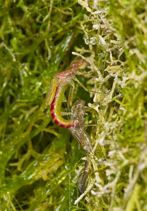 | The images on this page show a male Desert Firetail (Telebasis salva) emerging from its exuviae. For the main page on Desert Firetail go here. These shots were taken in Austin, Travis Co., Texas, in March, 2010, with a Canon EOS 1D Mark IV and an EF 180mm F/3.5 Macro, and a Macro flash. | ![]() |