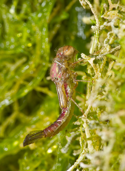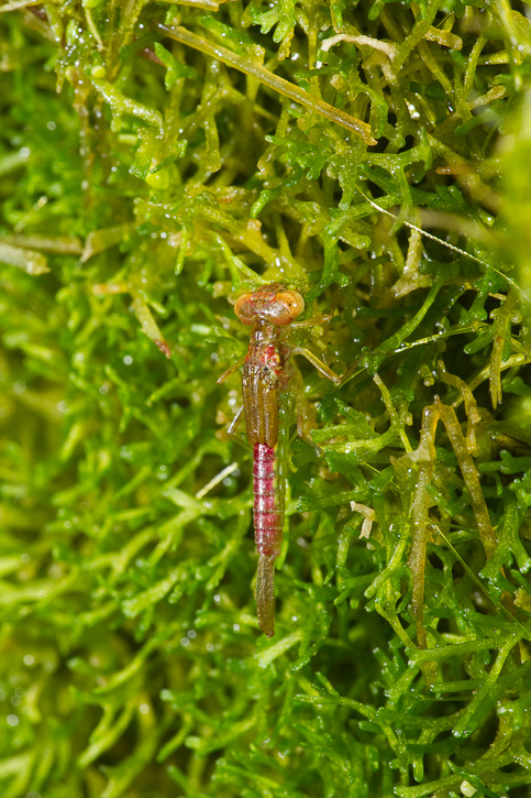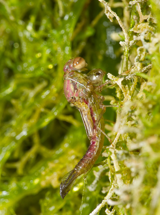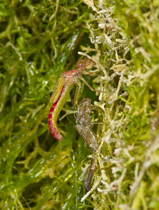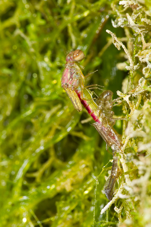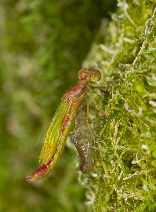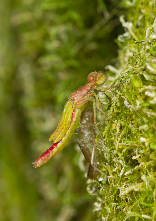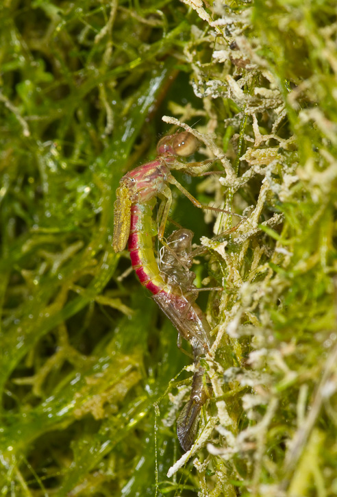 | The images on this page show a male Desert Firetail (Telebasis salva) emerging from its exuviae. For the main page on Desert Firetail go here. These shots were taken in Austin, Travis Co., Texas, in March, 2010, with a Canon EOS 1D Mark IV and an EF 180mm F/3.5 Macro, and a Macro flash. | ![]() |