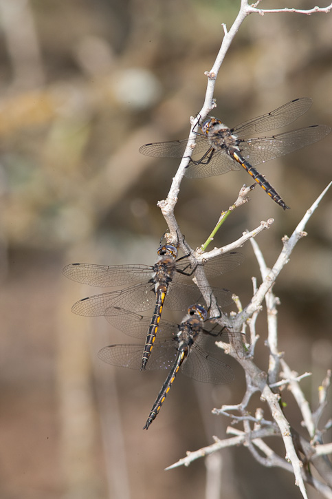 | The next 4 images again show Dot-winged Baskettails from Austin, Travis Co., Texas, in March, 2009. The same photo gear as previously described was used. The shot shown here shows 3 individuals perched closely together which is frequently observed. Note that the middle individual in the image to the left shows no "dots" on the wings, which is not unusual for this species in central Texas. | ![]() |