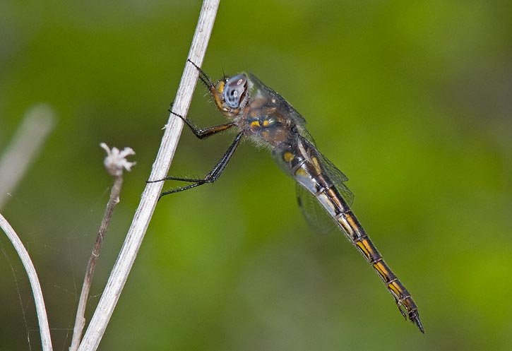 | The next 2 shots show the same recently emerged male Dot-winged Baskettail in Austin, Travis Co., Texas, in March, 2009. In the first image the insect is perched with its wings folded over its back, something that recently emerged dragons sometimes do. The insect could fly fine, however, and after a few short flights it started perching with its wings spread as can be seen in the next image. This is about as fresh as you can get for an adult dragonfly. | ![]() |