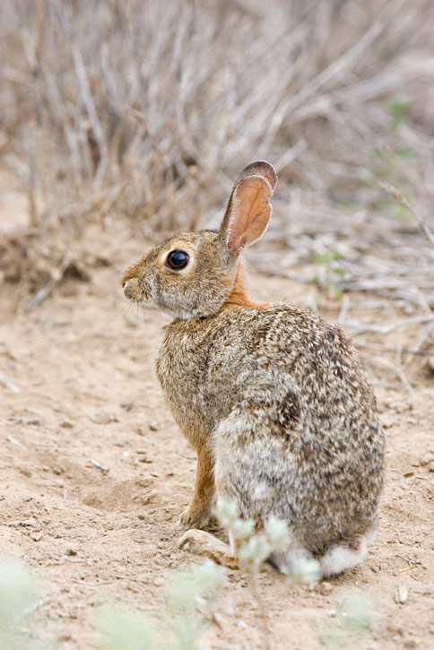 | The Eastern Cottontail (Sylvilagus floridanus) is a resident across most of the eastern United States. The first five shots shown here were taken in Starr Co., Texas, in April, 2007, a location where the range of this animal and the similar Desert Cottontail (S. audubonii) overlap. The smaller ear size of this animal in comparison to Desert Cottontail suggest it is Eastern Cottontail. | ![]() |