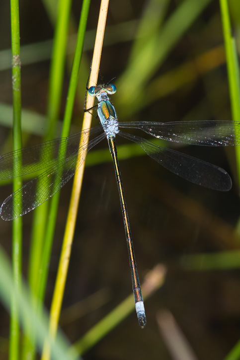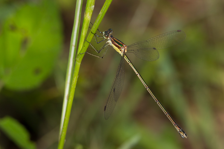 | The Elegant Spreadwing (Lestes inaequalis) is an eastern species whose range barely enters far east Texas. It is larger than the Swamp Spreadwing (Lestes vigilax) with which it is sometimes found, but has more yellow on the underparts and a thinner brown shoulder stripe. It also appears to be more extensively green on the back than Swamp Spreadwing. The key feature, however, is that the paraprocts (lower male appendages) extend farther outward than do the cerci (upper appendages). This may be seen in the field with close focus binoculars or in the hand. The male Elegant Spreadwing in the 2 shots shown here was in the Angelina National Forest, Jasper Co., Texas, in June, 2009. These shots were taken with a Canon EOS 1D Mark III and EF 300mm F/4 l IS lens and 2X extender and 580 flash. |