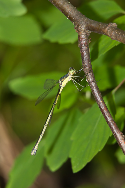 | The female Elegant Spreadwing in the next two shots was along Plum Creek near Sayner, Vilas Co., Wisconsin, in July, 2011. These shots were taken with a Canon EOS 1D Mark IV and a Sigma 50-500mm lens and Canon 580 flash. |
