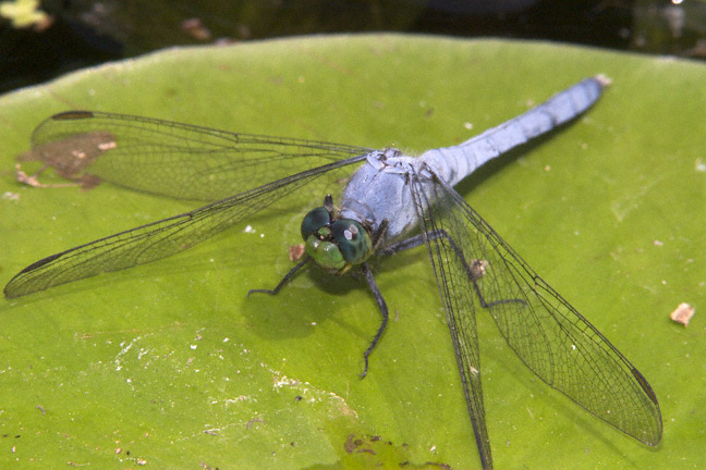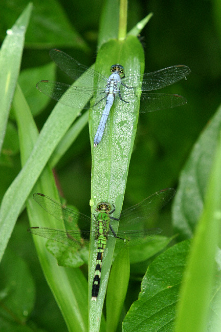 | The Eastern Pondhawk (Erythemis simplicicollis) is a common and widespread dragonfly over the eastern two thirds of the U.S. This species, along with the Western Pondhawk (Erythemis collocata) have now been officially "lumped" and are regarded as the same species under the name Common Pondhawk. I will maintain this separate page for this subspecies, regardless. The male is blue and the female green. The male at right was was a digital capture in May, 2003, in Austin, Travis Co., Texas using a Canon 10D with an EF 300 mm F4 L IS lens and 1.4 X extender. The shot of the female next was also a digital image with the same equipment in May, 2003, in Angelina Co., Texas. | ![]() |