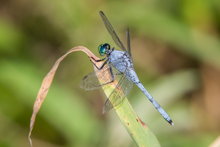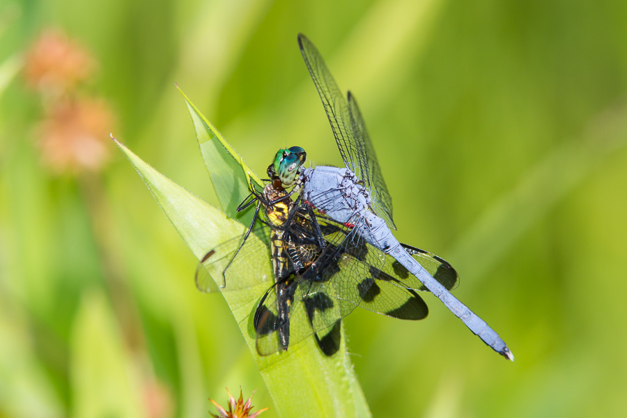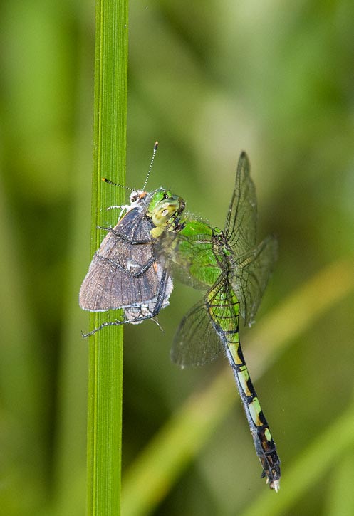 | The young male Eastern Pondhawk on the right, with a prey item, was along the Blanco River, Blanco Co., Texas, in July, 2012. This shot was taken with a Canon EOS 1D Mark IV and an EF 300mm F/4 L IS lens and 1.4X extender. | ![]() |