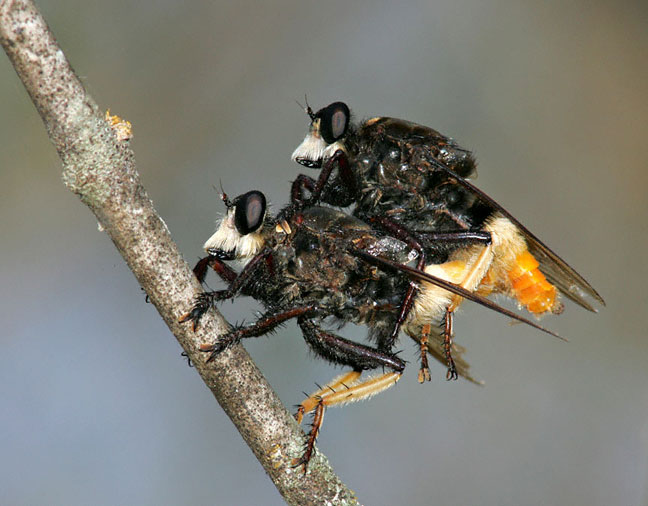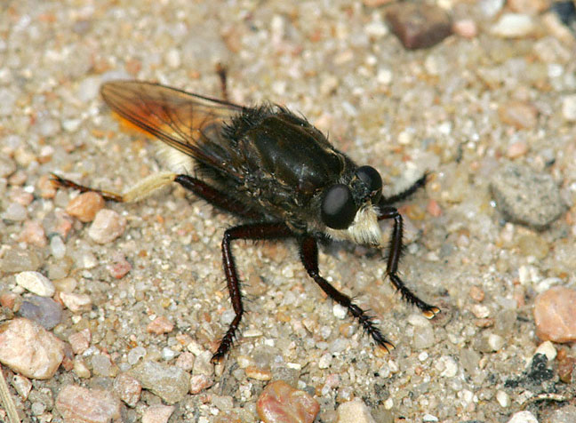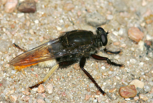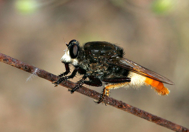 | This robber fly is known as Eccritosia zamon and was photographed in Austin, Travis Co., Texas in September 2004 with a Canon EOS 1D Mark II and an EF 300 mm F/4L IS lens with a 2X extender and 550 EX flash. Refer to Giff Beaton's photos of this same species taken at the same location here. | ![]() |