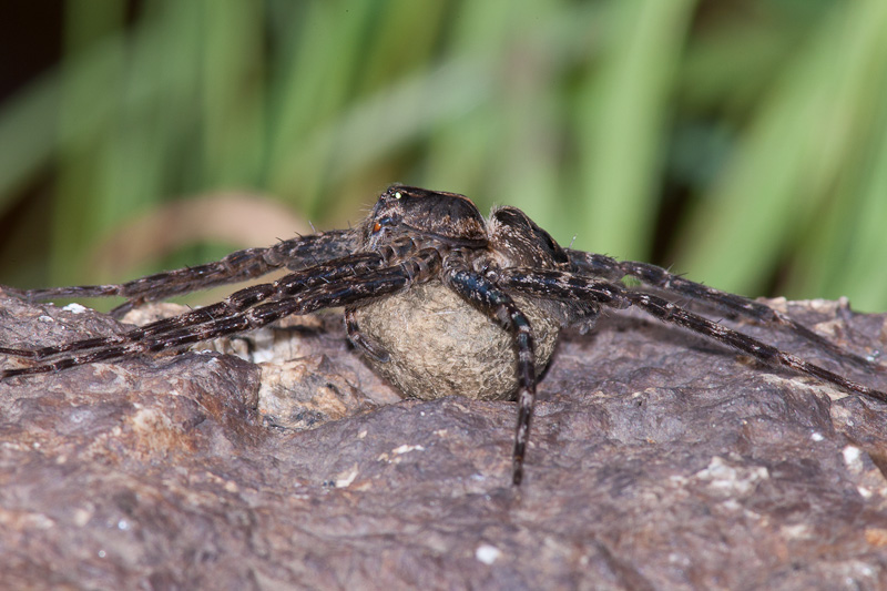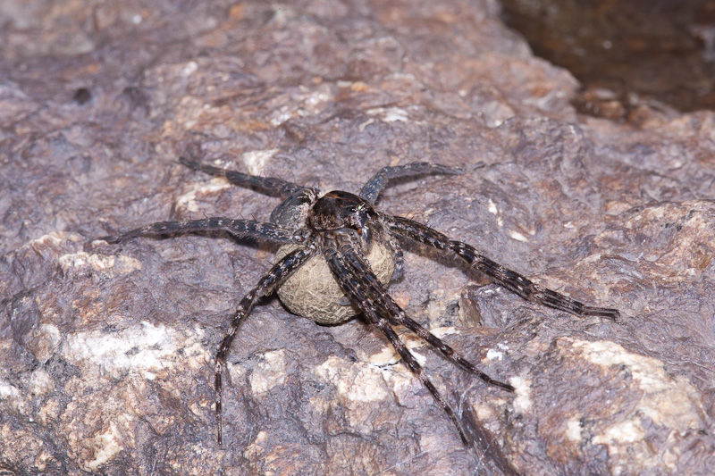| The next five shots of a Fishing Spider were taken in August, 2009, along the edge of the Narraguagus River, in Washington Co., Maine. This spider appears to be guarding an egg case. The images were taken with a Canon EOS 1D Mark III and an EF 300mm F/4 L IS lens and 2X extender and 580 flash. | ![]() |