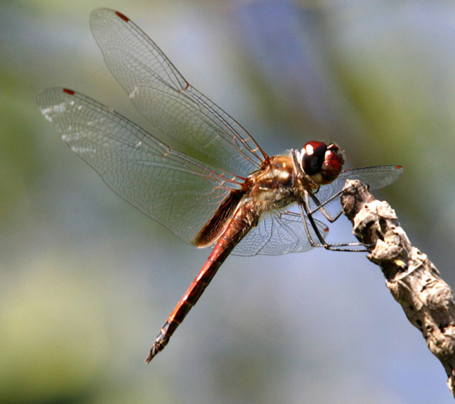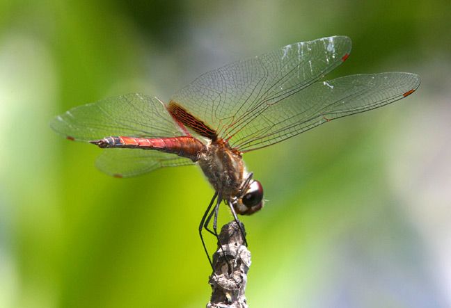 Here are three shots of male and female of a Tramea species dragonfly from the Galapagos Islands in July, 2003. Several experts have examined these images; one believes that the species is Tramea calverti while the other thinks it is Tramea cophysa. So far I have not been able to resolve this. This species was not uncommon and I saw it on several of the islands visited. Any more thoughts on the ID of this dragonfly will be appreciated. | ![]() |