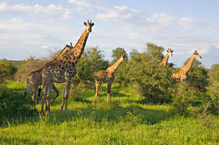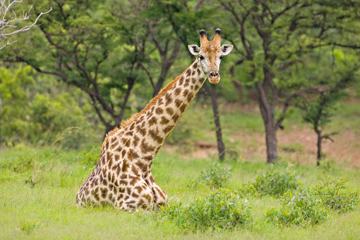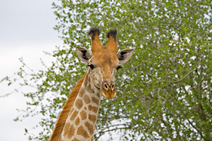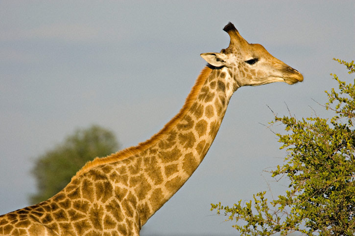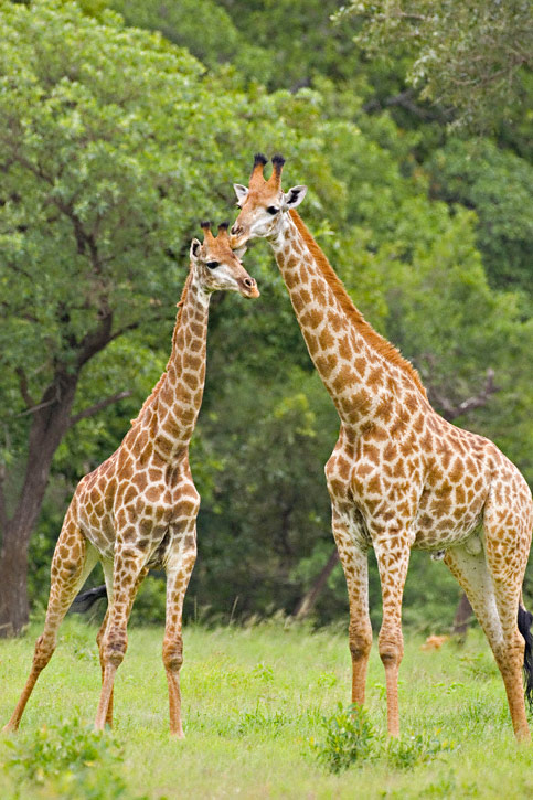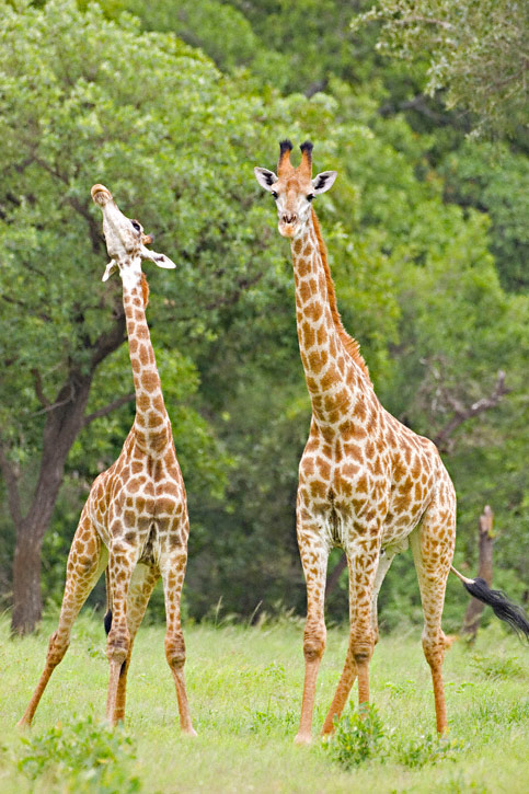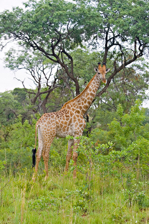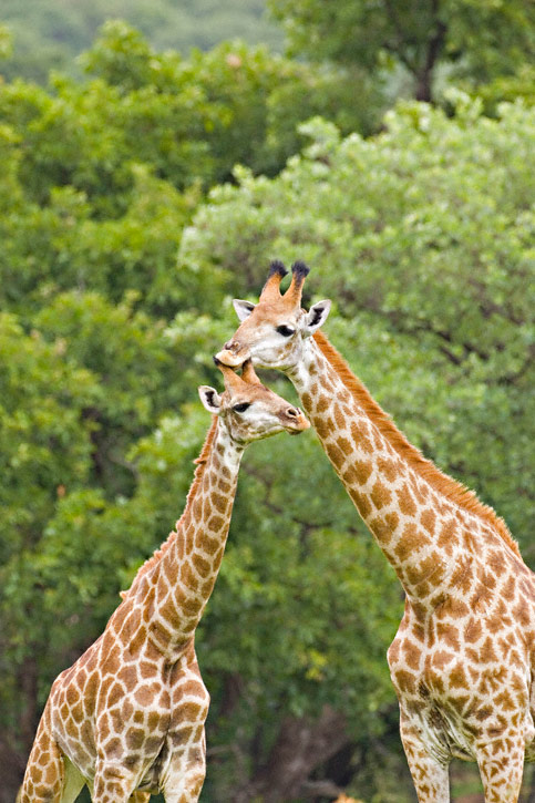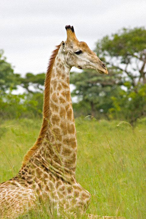 | The Giraffe (Giraffa camelopardalis) is one of the characteristic large mammals that one may see when visiting game parks in much of southern Africa. The Giraffe is the tallest animal in the world with males approaching 20 feet in height and weighing over 4000 pounds! The images shown here were taken with a Canon EOS 1D Mark II and EF 70-200mm F/2.8 L IS lens and 2X extender in January, 2006. The shots were taken at several different game reserves in South Africa including the Nylsvley Nature Reserve, Kruger National Park, and the Mauricedale Game Reserve. | ![]() |