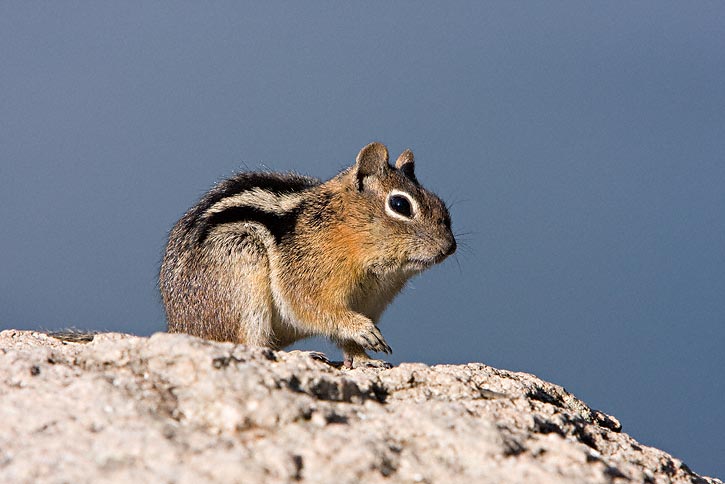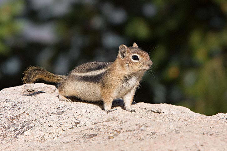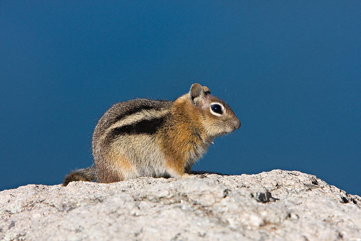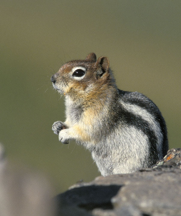 | The Golden-mantled Ground-Squirrel (Spermophilus lateralis) is a resident of a wide variety of habitats in the American West. It ranges from parts of southwest Canada down to some areas of southern California and eastward into central New Mexico. The shot on the right is of an individual at Yellowstone National Park, Teton Co., Wyoming, in August, 1999. It was shot with a Canon EOS 3 and EF 300mm F/4 L IS lens on Fuji Sensia. Scroll down for more images. | ![]() |